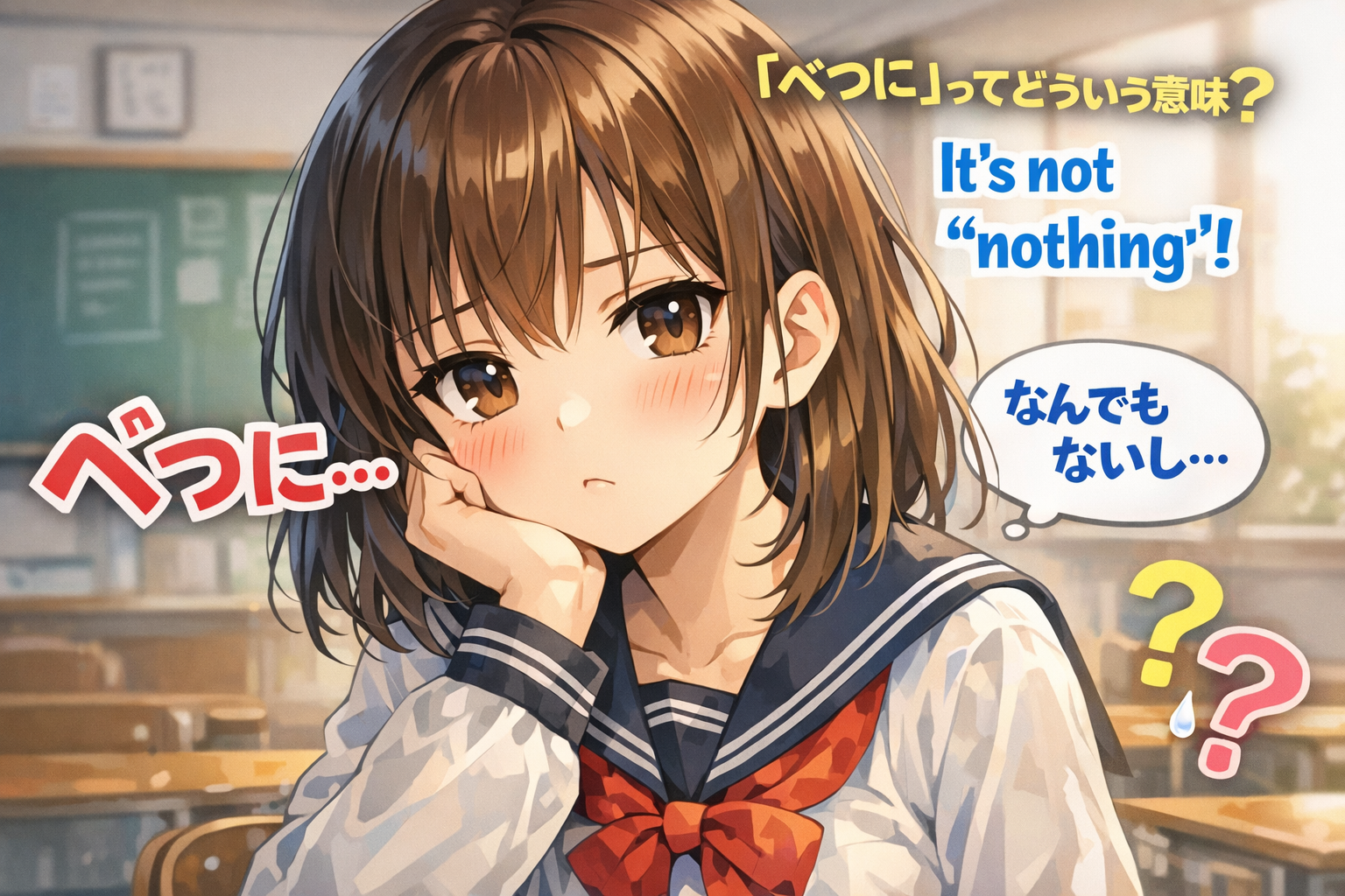 “Betsuni (別に)” means “nothing” or “not really,” but it is often used to hide true feelings. In anime and real conversations, it frequently appears after someone does something meaningful but pretends it was not.